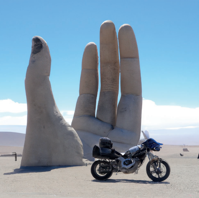 I et uendelig ørkenlandskap stiger en gigantisk hånd i sandstein opp som et slags glemt monument. En motorsykkel – nærmest svevende – står parkert foran. Den virker skjør. I bakgrunnen svever noe som ligner vinger. Fingeren på hånden mangler. Hva skjer egentlig her?