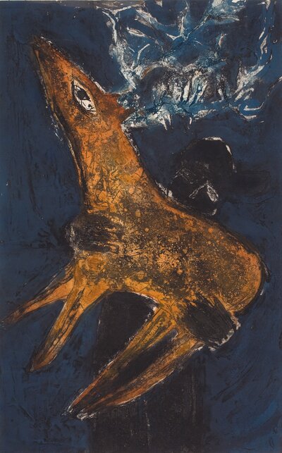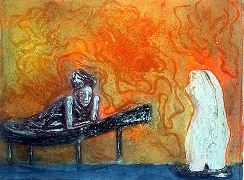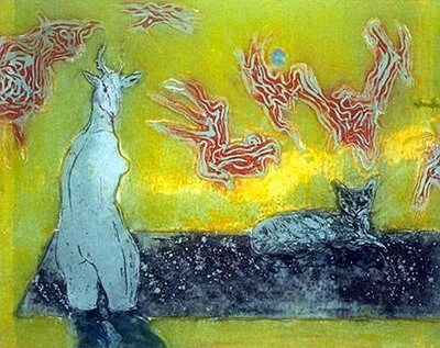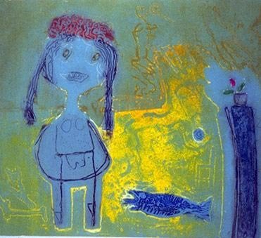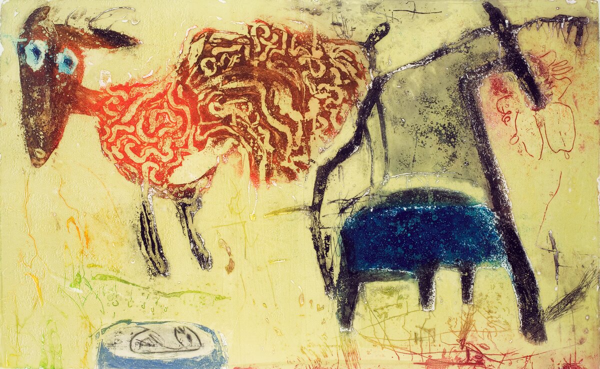 Ellen Karin Mæhlums (f. 1957) grafiske arbeider beveger seg innenfor et figurativt formspråk, og flere av hennes bilder har et naivistisk og tidvis ekspressivt uttrykk. Motivene er som oftest mennesker eller dyr, men innholdet i en dameveske kan også fange hennes blikk.