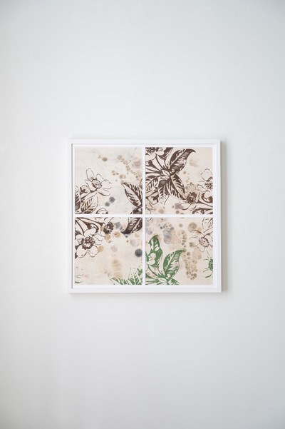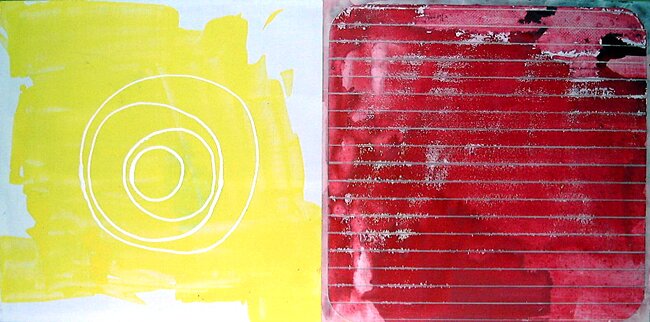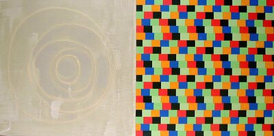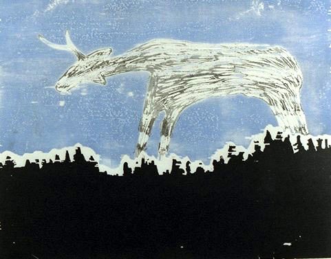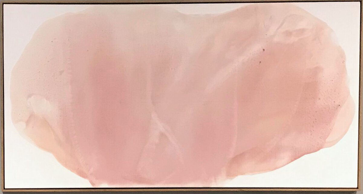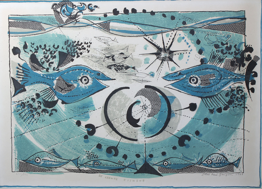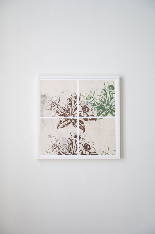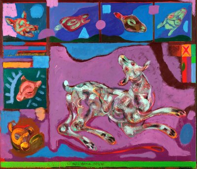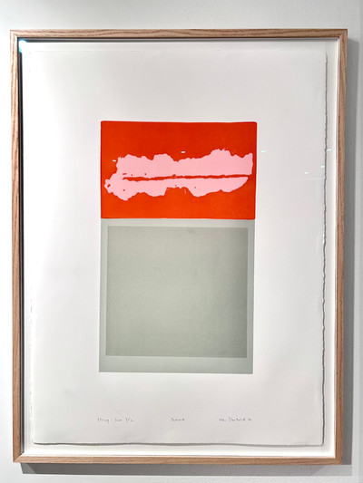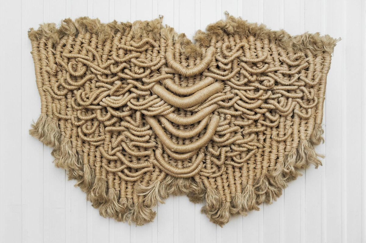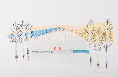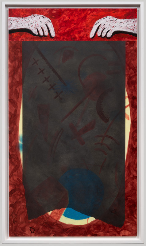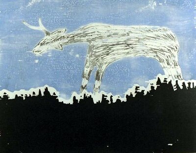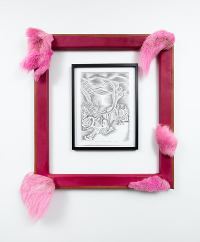 Ramme dekorert med farget reinskinn og garva skinn av reinsdyr og geit. Rammen rammer inn et trykk av Iver Jåks. , 90x80cm