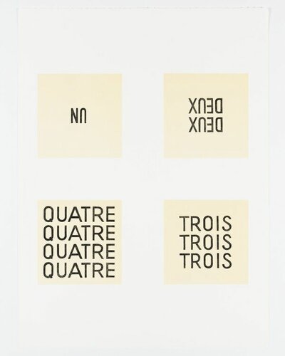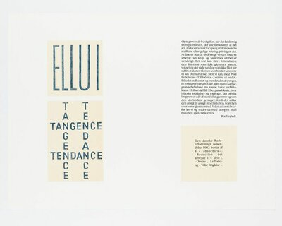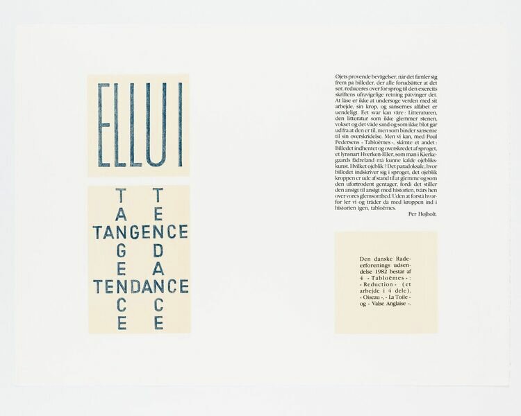 Denne utstillingen består av 15 verk av 12 danske, og én japansk kunstner fra 1970 og 80-tallet. Felles for dem er en eksperimenterende og idébasert tilnærming til grafikk, og en særlig interesse for det som oppstår i møtet mellom bilde og tekst.