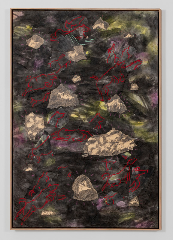 Papircollage, blekk, vannmaling og oljekritt på lerret, 120x80cm
