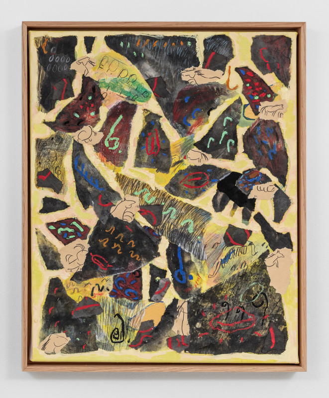 Olje, papircollage, fargeblyant, blekk og oljekritt på lerret, 50x40cm